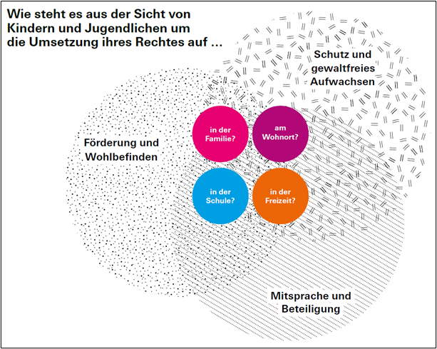 Die Studie thematisiert entlang der Förder-, Schutz- und Beteiligungsrechte eine zentrale Bandbreite an Rechten innerhalb der Lebensbereiche Familie, Schule, Freizeit und Wohnort (siehe Abbildung 1). Durch diese vielfältigen Themenfelder der Kinderrechte-Studie gelingt es, ein umfassendes Bild über die Lebensbedingungen der Kinder und Jugendlichen aus ihrer eigenen Perspektive zu erhalten. Zudem konnte umfassend erfragt werden, welche Veränderungen ihrer Einschätzung nach nötig sind, um die Umsetzung der Kinderrechte sowohl in den einzelnen Lebensbereichen als auch gesamtheitlich zu verbessern. Die Studie weist in allen Bereichen auf Herausforderungen und Lücken in der Umsetzung der Kinderrechtskonvention in der Schweiz und Liechtenstein hin. Die Ergebnisse verdeutlichen ausserdem, dass auf die Situation armutsbetroffener Kinder und Jugendlicher ein besonderer Fokus gelegt werden muss, damit auch sie ihre Rechte wahrnehmen können.